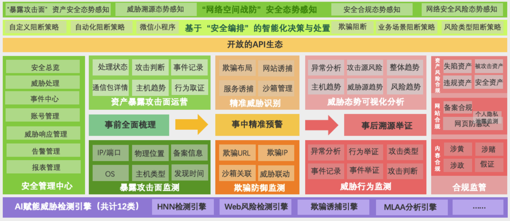 基于 AI赋能、资产“暴漏攻击面”和“欺骗诱捕”检测与分析、融合“业务编排”的智能化全周期安全检测响应系统。在不改变网络拓扑环境的现有基础上,采用旁路流量镜像模式,基于多种威胁检测引擎,运用机器学习和 DPI 深度流分析技术提供海量异常行为检测能力,以安全可视和协同防御为核心提供“无间隔”精准安全联动防御能力,并通过大数据分析平台实现智能化统一安全运营,让安全风险可看见、安全威胁可感知、安全运营可赋能。